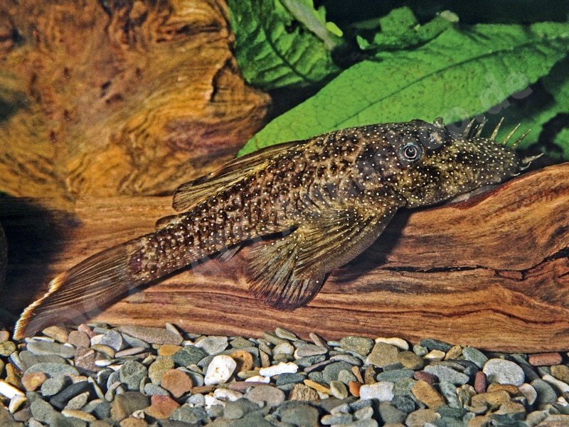 A beautiful rather small, highly variable bristlenose catfish olive to dark brown in color and with a reddish brown seam in the caudal fin, which may end in a white border. The yellowish dots may be fine to a little coarser or miss almost entirely in some specimens, which corresponds to our image of the L 150.
